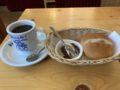 おかわりのサラダの横に珈琲がおかれています。メニューにも書いてないし、何も説明がないのは残念です。